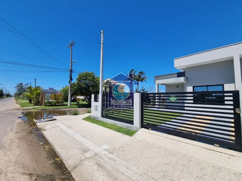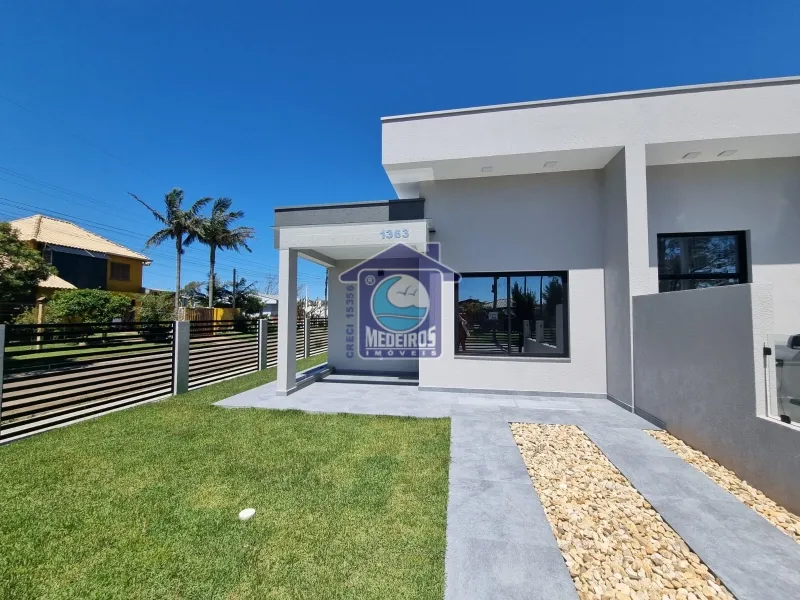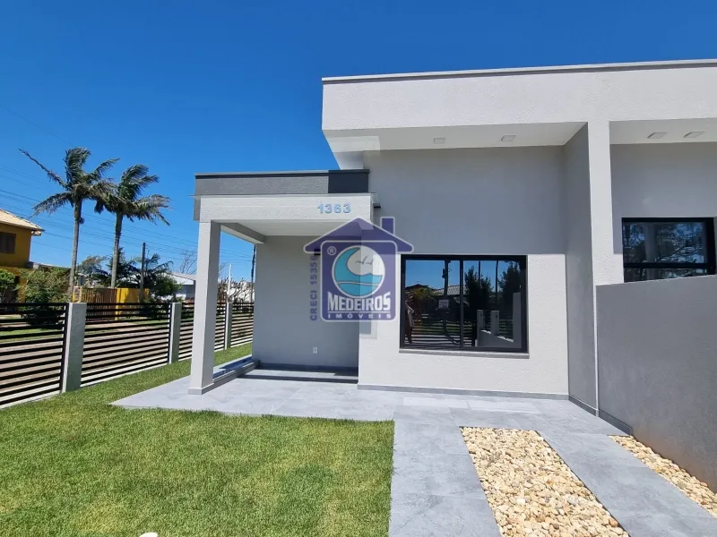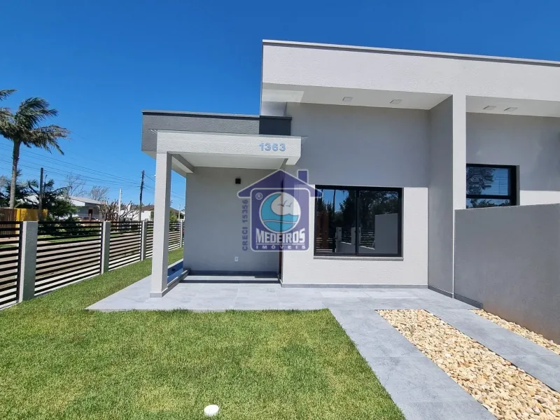 Casa geminada de alvenaria, com 64,66m² de área construída, terreno de 193,12m², composta por 2 dormitórios (sendo 1 suíte), sala de estar, lareira, cozinha, 1 banheiro social, área de serviço, churrasqueira, sem móveis, abrigo para o carro, laje de concreto, telha de amianto, cerca de PVC.