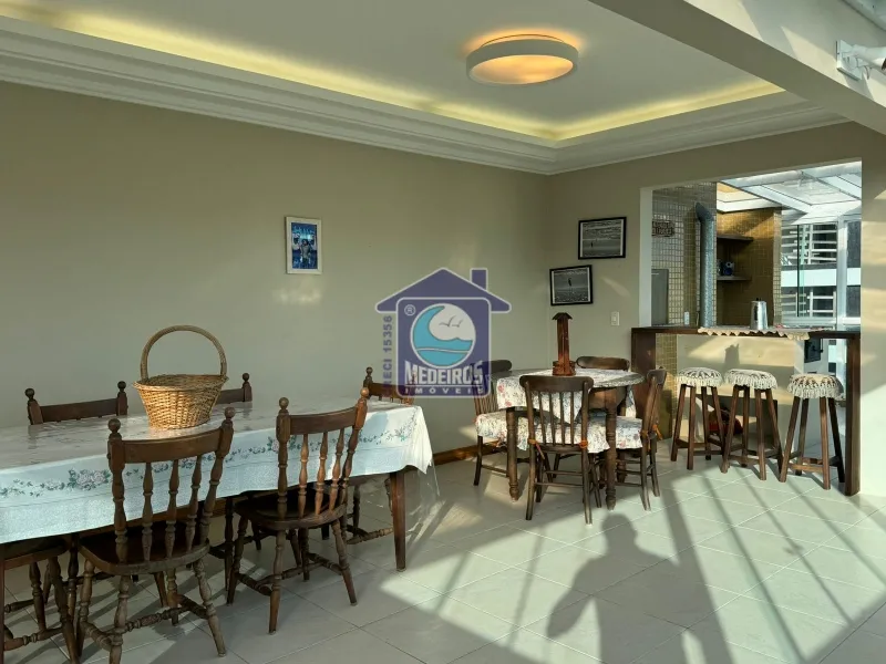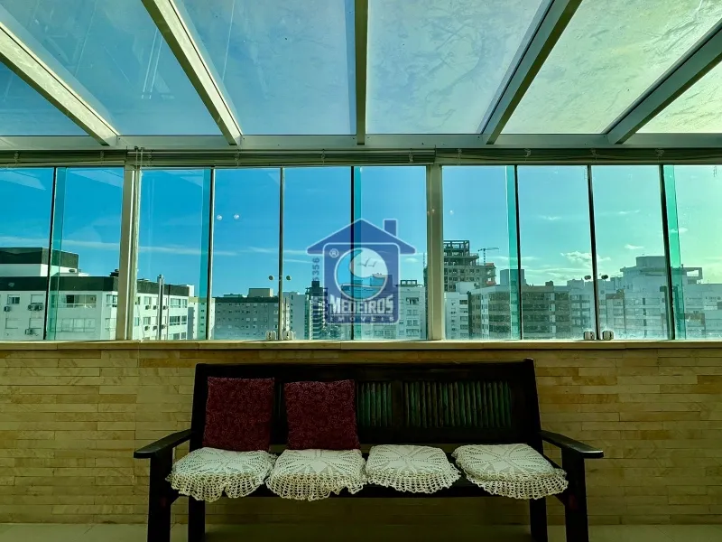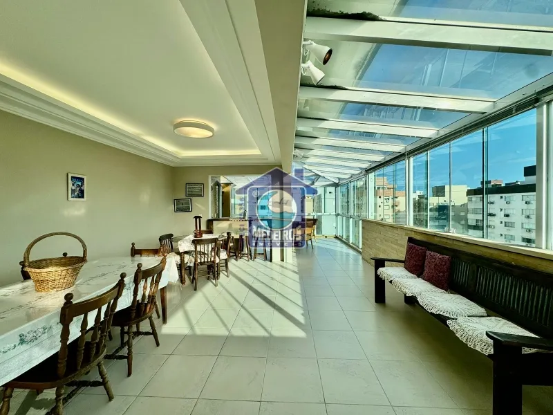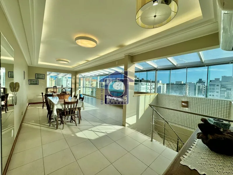 Cobertura com 206,26m² de área privativa, sendo na parte de baixo 2 suítes, 1 banheiro social, ampla sala de estar e sacada fechada, a parte de cima é composta por ampla sala de jantar, churrasqueira, fogão a lenha, cozinha aberta, área de serviço, lavabo, terraço, mobiliado, laje de concreto. O prédio possui 2 elevadores.
