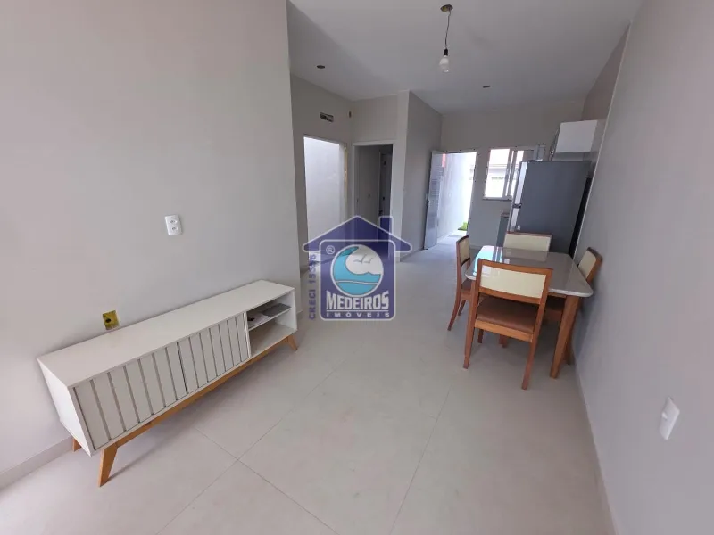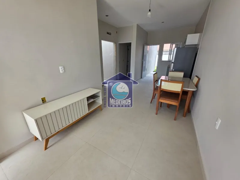 Casa geminada de alvenaria com 66m² de área construída, terreno de 150m² (6x25), composta por 2 dormitórios (sendo 1 suíte), sala de estar, cozinha, 1 banheiro social, área de serviço, churrasqueira, mobiliada, laje de concreto, telha de amianto, cerca de tela.